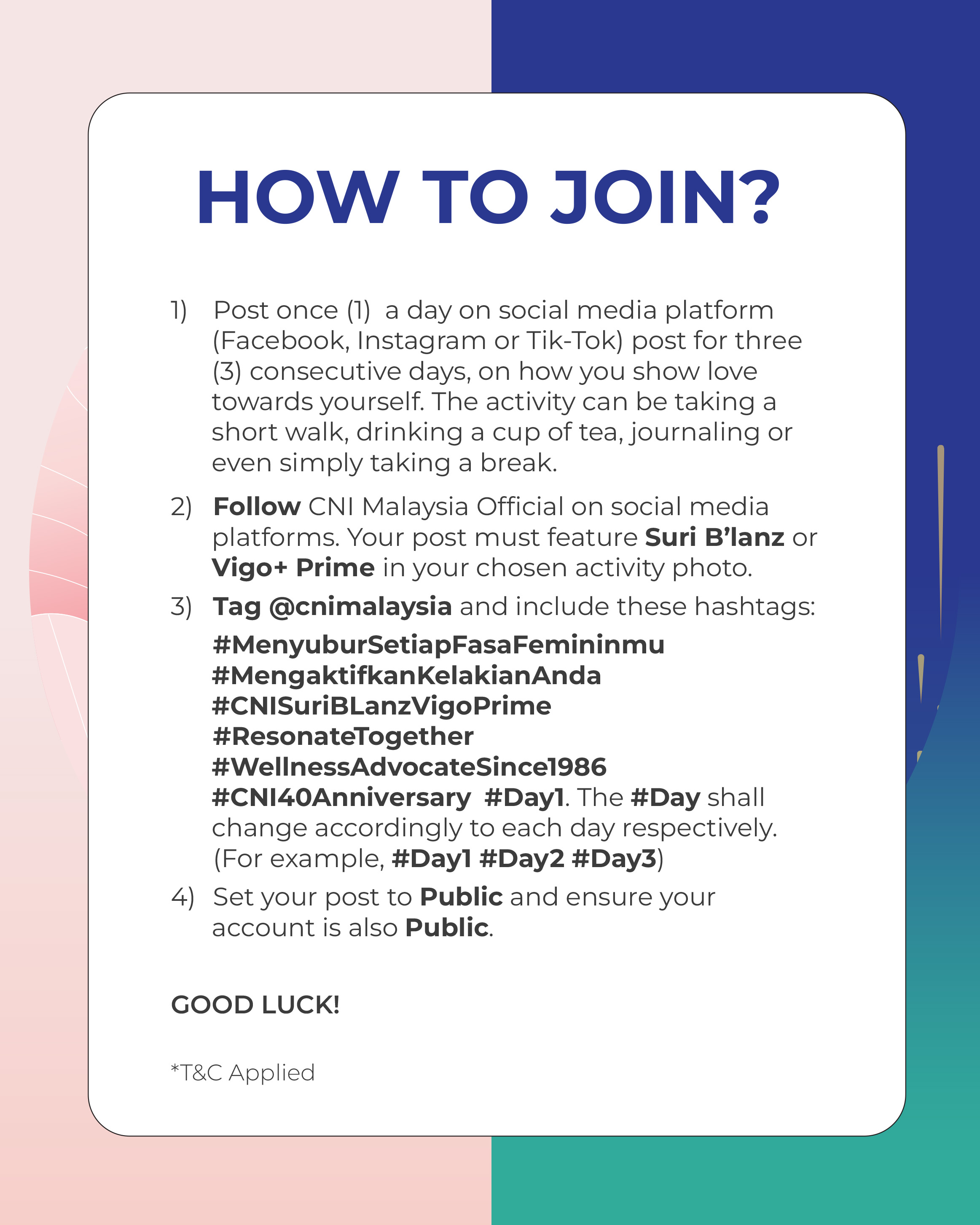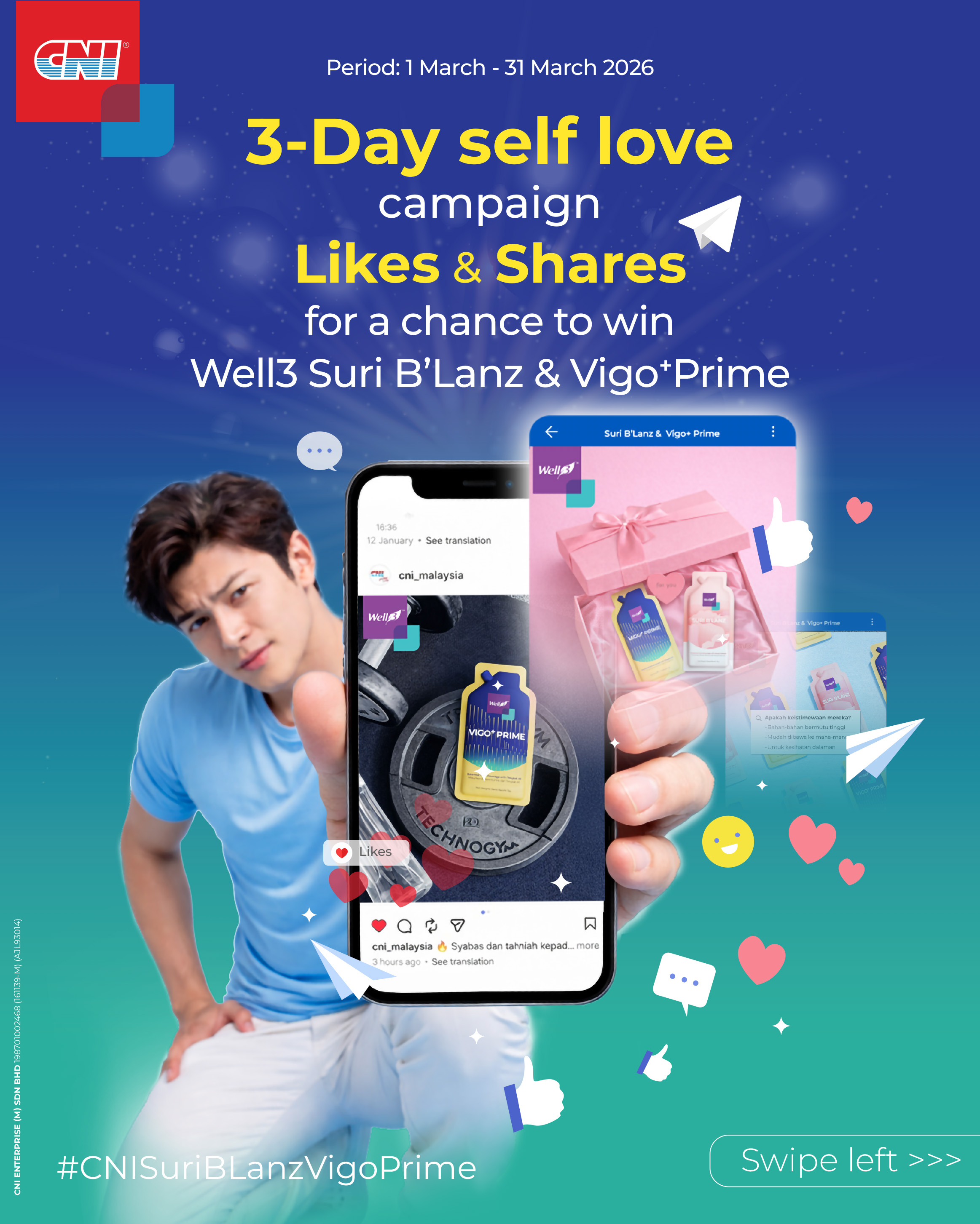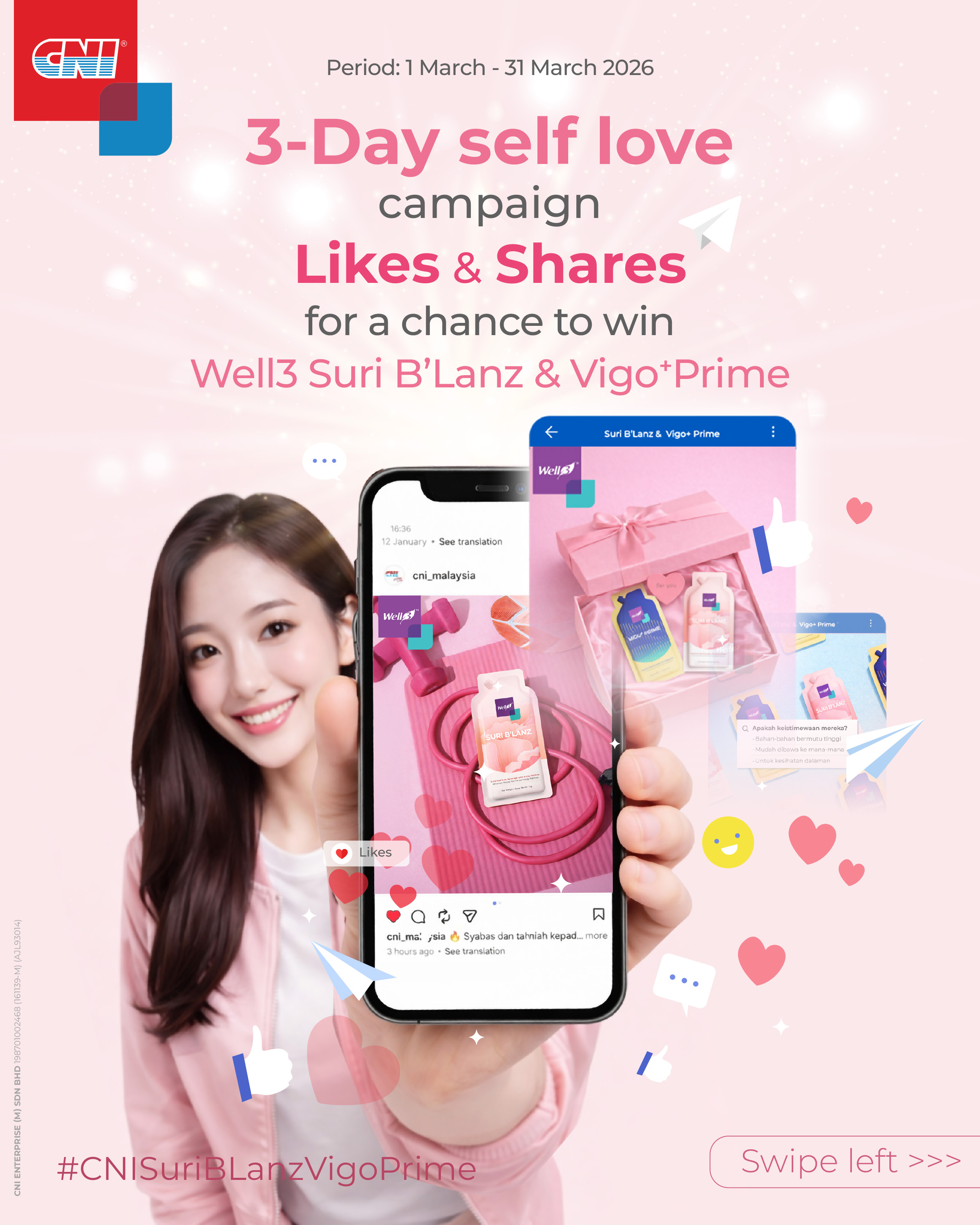 The following terms and conditions (“T&C”) shall apply to the “3 days self love campaign - SURI B’LANZ & VIGO+ PRIME (“the campaign”) organized by CNI Enterprise (M) Sdn Bhd and the affiliates (“the company”)